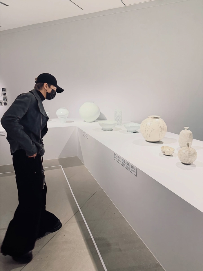 Selain fashion yang nge-hits, kunjungan RM ke pameran nunjukin sisi lain dari jiwa artistiknya. Punggungnya menghadap kamera, pakai topi item, masker, dan jaket kulit, dia keliatan lagi asyik banget nikmatin guci bulan (moon jar) putih. Momen hening ini dalem banget ngasih penekanan ke reputasinya sebagai kolektor seni sejati, pamerin koneksi dan rasa hormatnya yang mendalam buat keindahan estetika. ⚡
