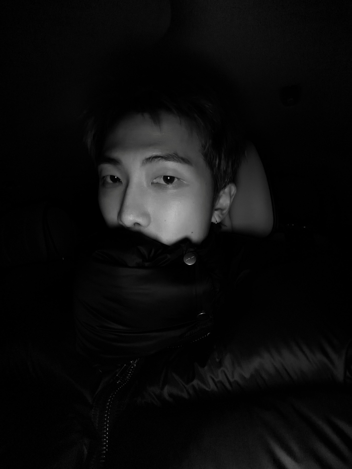 Di foto mirror selfie yang nempel di hati pas di dalem lift, RM pamerin style khasnya. Pakai jaket kulit yang sleek, kacamata klasik bertangkai tanduk, plus rambut blonde agak berantakan yang santai, dia ngeluarin pesona free-spirited. Tanda ‘V’ yang playful nambahin sentuhan karisma signature-nya. Foto hitam-putih lainnya nunjukkin dia di mobil, muka ketutupan dikit, tapi tatapan intensnya langsung ke kamera itu mangancar aura yang nggak tertandingi dan presence yang nguasain banget. 🎤